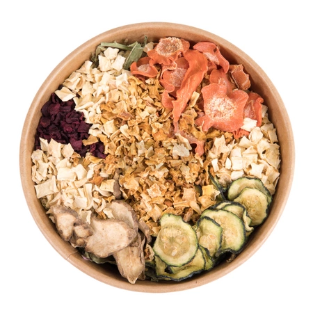 Korzeń mniszka lekarskiego (Taraxacum officinale radix) wspiera trawienie, działa przeciwzapalnie i pobudza wydzielanie żółci. Chipsy z suszonego korzenia można podawać w małych ilościach, 1–2 razy w tygodniu, szczególnie u zwierząt z delikatnym układem pokarmowym.