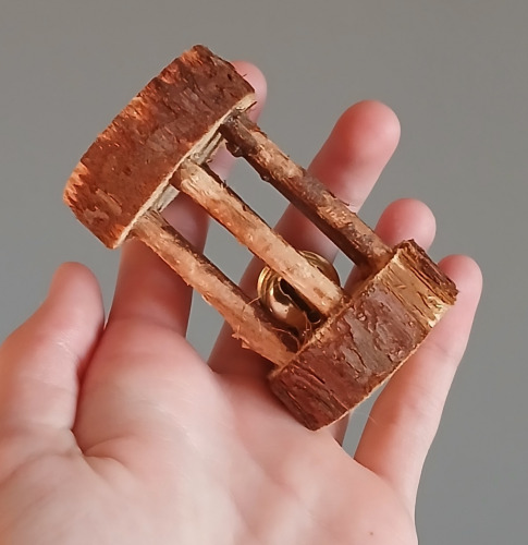 Drewniana rolka z dzwoneczkiem dla królika 7x5cm wykonana z naturalnego drewna zachęta futrzaki do ruchu. U nas dodatkowo napychamy do wnętrza sianka lub ziółek - zaangażowanie gwarantowane i zabawa trwa dłużej :).