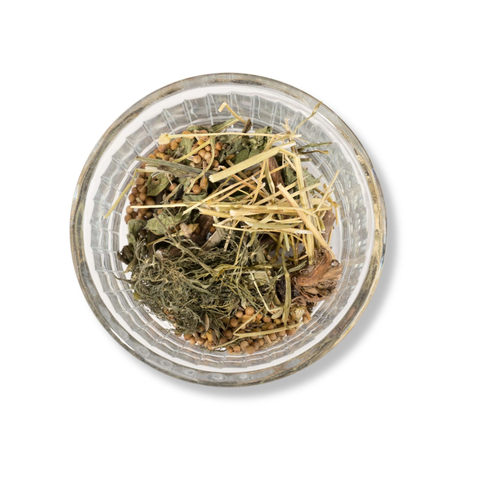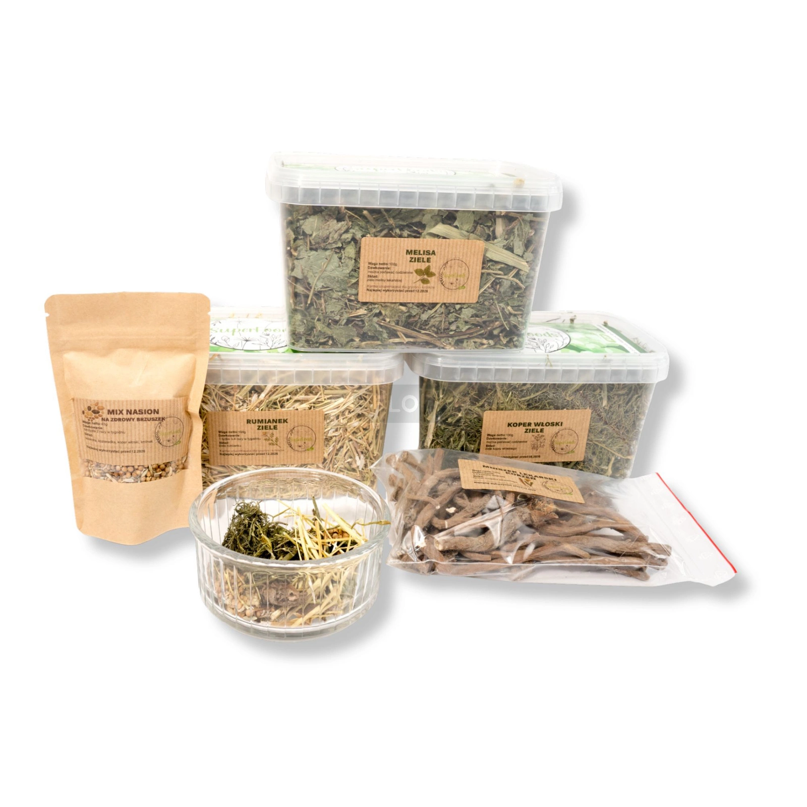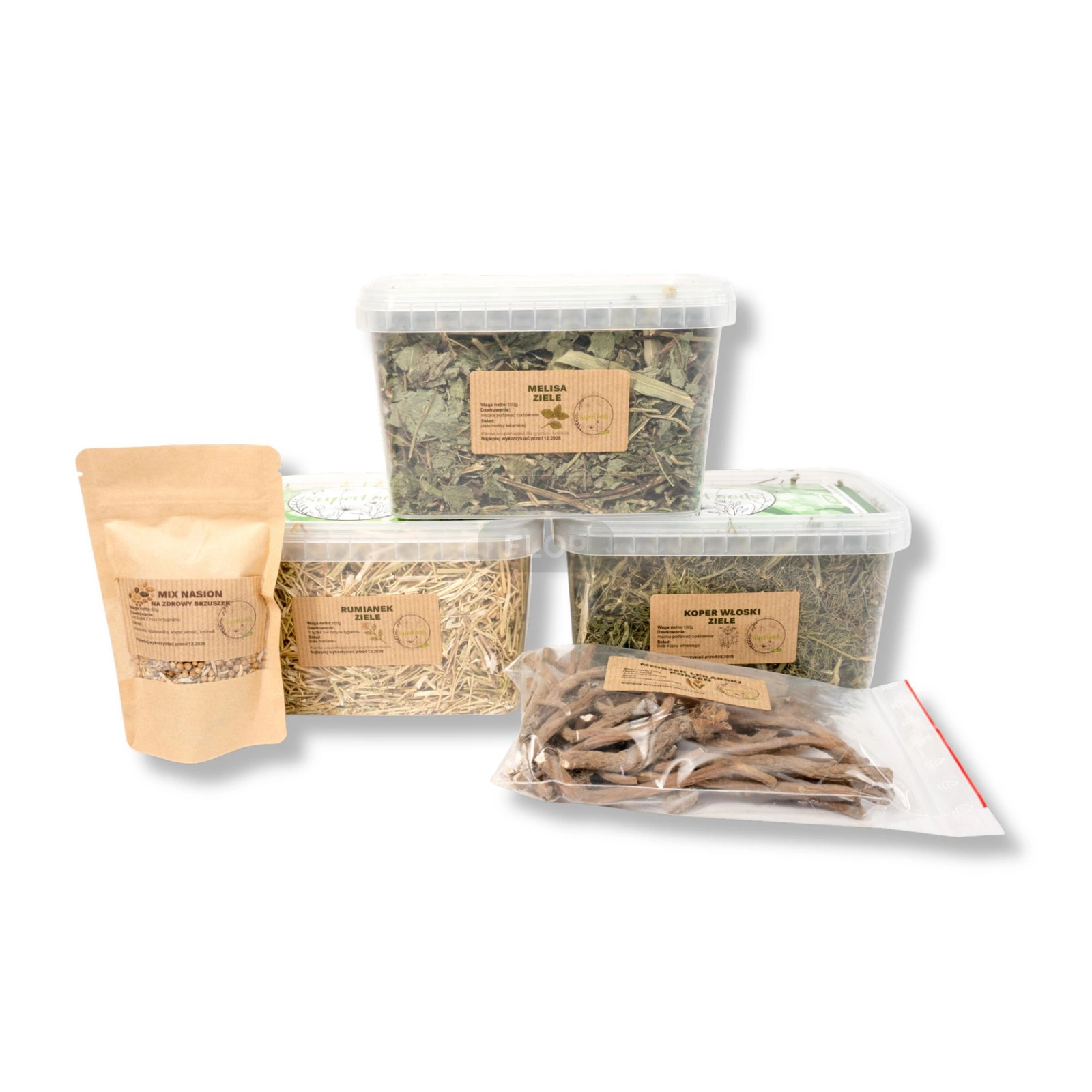 • Mieszanka nasion (kolendra, kozieradka, koper, kminek, rumianek) – prawdziwy koktajl roślin wspomagających układ pokarmowy. Kolendra i kminek działają rozluźniająco na jelita, rumianek łagodzi, a kozieradka i koper dodatkowo wspierają trawienie.
