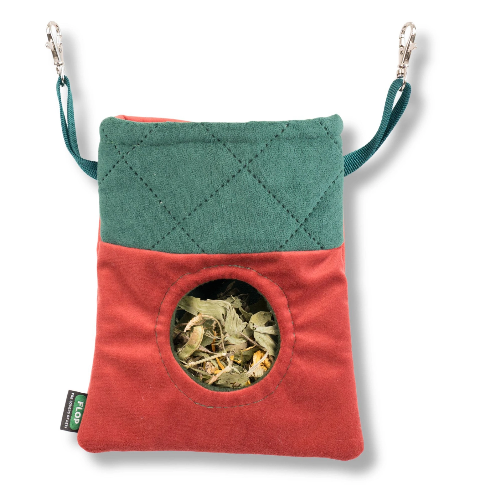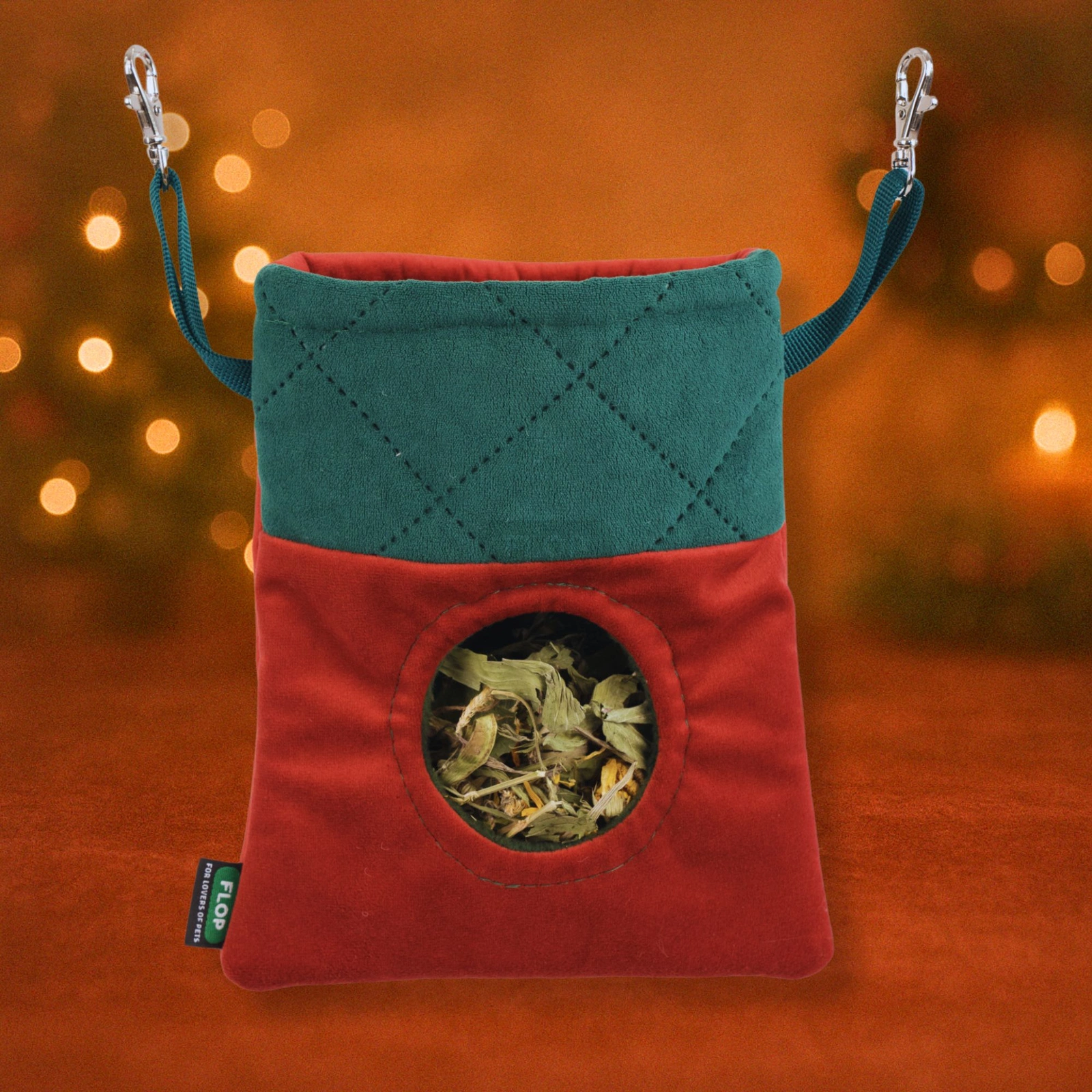 Świąteczny paśnik na sianko i zioła FLOP to elegancki i praktyczny dodatek do klatki kawii domowej. Wykonany z tkaniny Magic Velvet z kolekcji 2025 – pikowanej w kolorze głębokiej zieleni oraz gładkiej czerwieni inspirowanej barwą świątecznego grogu – zachwyca zarówno wyglądem, jak i funkcjonalnością. Sianko lub zioła wkłada się od góry, przez duży otwór, natomiast świnka wyciąga je przez okrągły otwór w przedniej ściance. Rozwiązanie proste, skuteczne i dużo czystsze niż tradycyjne metalowe paśniki.